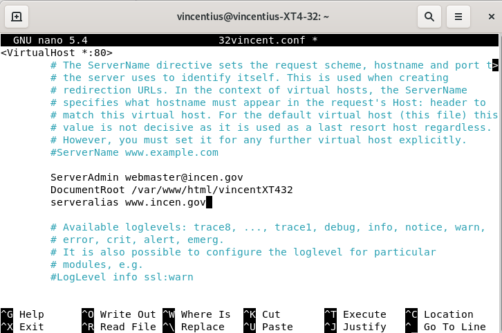 Selanjutnya jika kalian sudah masuk ke file ubah localhost pada baris Serveradmin menjadi nama domain kalian(nama domain boleh terserah asalkan ada tambahan .com/.id/yang lain), tambahkan slash(/) folder html kalian(di nomor 5) setelah html di baris Documentroot, lalu tambhakan serveralias www.domainkalian. Sehingga hasilnya seperti pada contoh diatas